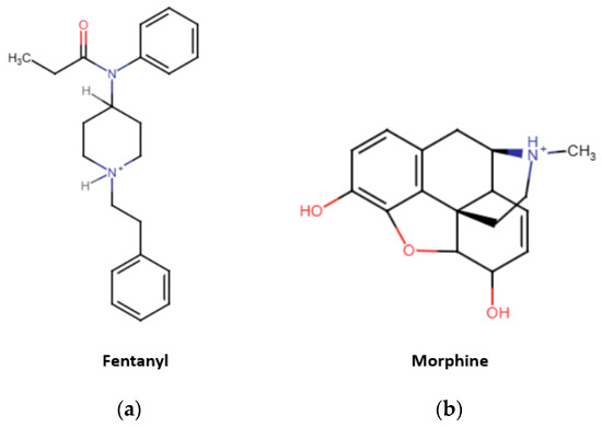 Notably, fentanyl possesses several distinctive characteristics compared to other, more traditional μ opioid receptor agonists such as morphine, a natural alkaloid whose isolation from opium, a product of the opium poppy (Papaver somniferum), in the nineteenth century is generally credited to German apothecary Friedrich Sertürner [6]. For instance, fentanyl’s elongated chemical structure and rotatable bonds confer greater flexibility than morphine’s interconnected rings [7]. Moreover, in contrast to most other opioids, fentanyl’s protonated nitrogen (which interacts with Asp1473.32 within the μ opioid receptor) is positioned in the middle of the molecule [7]. This may permit multiple binding poses for fentanyl within the orthosteric binding pocket of the μ opioid receptor [8,9,10,11], while morphine only appears to adopt one binding pose within the μ opioid receptor [12]. Structural differences between fentanyl and morphine are illustrated in Figure 1.