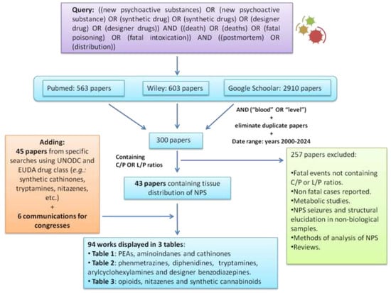 Initially, a search using the following query: (“new psychoactive substances” OR “new psychoactive substance” OR “synthetic drug” OR “synthetic drugs” OR “designer drug” OR “designer drugs”) AND (“death” OR “deaths” OR “fatal poisoning” OR “fatal intoxication”) AND (“postmortem” OR “distribution”) was performed in PubMed, Wiley and Google Scholar [] as can be seen in workflow diagram, see Figure 1. This search returned approximately 563 publications in PubMed, 603 in Wiley, and 2910 in Google Scholar. By refining these results using inclusion criteria—specifically, publication years 2000–2024, presence of toxicological data in blood samples (AND (“blood” OR “level”)), and removal of duplicates—we narrowed the selection to about 300 studies. Further filtering for studies that reported postmortem levels in cardiac or peripheral blood as well as liver concentrations reduced the pool to 43 relevant publications.