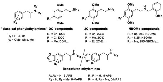 - “Classical phenylethylamines derivatives”, “DOX series”, “2C-X series”, “NBOMes” and “benzofuranethylamines type”.