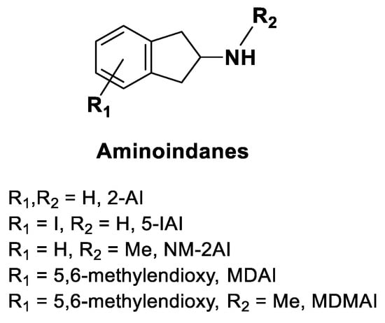 Aminoindanes are structurally rigid analogs of phenylethylamines, characterized by a closed ring system. This core structure can be modified in various ways, such as adding functional groups to the aromatic ring, incorporating a methylenedioxy bridge, or N-alkylation. 2-Aminoindane (2-AI) is a mild central nervous system (CNS) stimulant with slight bronchodilator activity and strong analgesic effects. Unlike the corresponding amphetamines, some animal studies have shown that these substances do not cause long-term neurotoxicity. Aminoindanes have been explored as bronchodilator and analgesic agents and, more recently, as neuroprotective and antipsychotic medicines. Common derivatives of the aminoindane group include: 2-AI, 5,6-methylenedioxy-2-aminoindane (MDAI), 5,6-methylenedioxy-N-methyl-2-aminoindane (MDMAI), 5-iodo-2-aminoindane (5-IAI), 5-methoxy-2-aminoindane (MEAI), and 5-methoxy-6-methyl-2-aminoindane (MMAI), as shown in Figure 3.