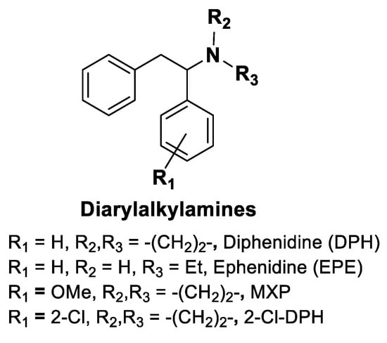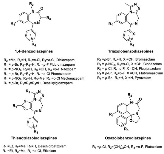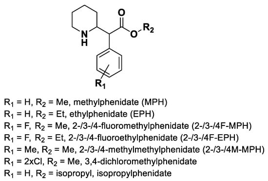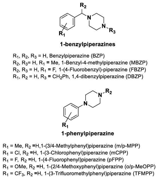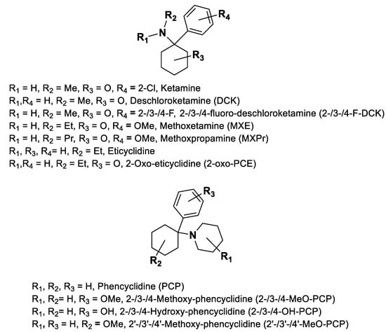 NPSs have been categorized into eleven groups according to their chemical structure, as detailed in the subsections of Section 3, Results and Discussion. This classification helps to clarify their chemical properties, such as pKa and logP, which are valuable for understanding their potential tendency for PMR. Based on our experience [] and the current classifications by UNODC and EUDA [,], the chemical structures of these groups are presented in Supplementary Table S1, which includes the following: