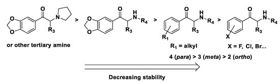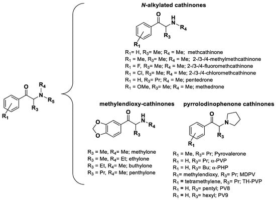 - Cathinones (β-oxo-substituted phenethyl-amines).