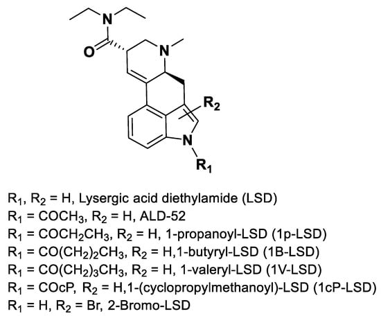 A 23-year-old woman died after inhaling an unknown substance, suspected to be “synthetic LSD” []. Toxicological analysis revealed a combined drug toxicity involving 25I-NBOMe, 25H-NBOMe, and 25C-NBOMe, with concentrations of 28 ng/mL, 1 ng/mL, and 0.7 ng/mL, respectively. Additionally, methylamphetamine, tetrahydrocannabinol, and promethazine were detected. In another study, 25B-NBOMe was detected in postmortem blood at levels of 66.5 and 661 ng/mL [].