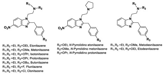 - Ujváry, I.; Christie, R.; Evans-Brown, M.; Gallegos, A.; Jorge, R.; de Morais, J.; Sedefov, R. DARK Classics in Chemical Neuroscience: Etonitazene and Related Benzimidazoles. ACS Chem. Neurosci. 2021, 12, 1072–1092. [Google Scholar] [CrossRef] [PubMed]