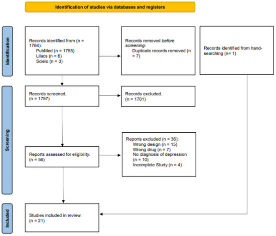 The search was conducted using PubMed, LILACS, and SciELO databases using the following string: (cancer) AND ((antidepressants) OR (psychedelics) OR (psilocybin) OR (LSD) OR (ketamine)) AND ((trial) OR (randomized controlled trials) OR (double-blind procedure)). Studies published until 14 July 2024 were included without language restriction. A flow diagram illustrating the different phases of the systematic search update is presented in Figure 1. The protocol for the systematic review of our study was registered for PROSPERO (CRD42023429203).