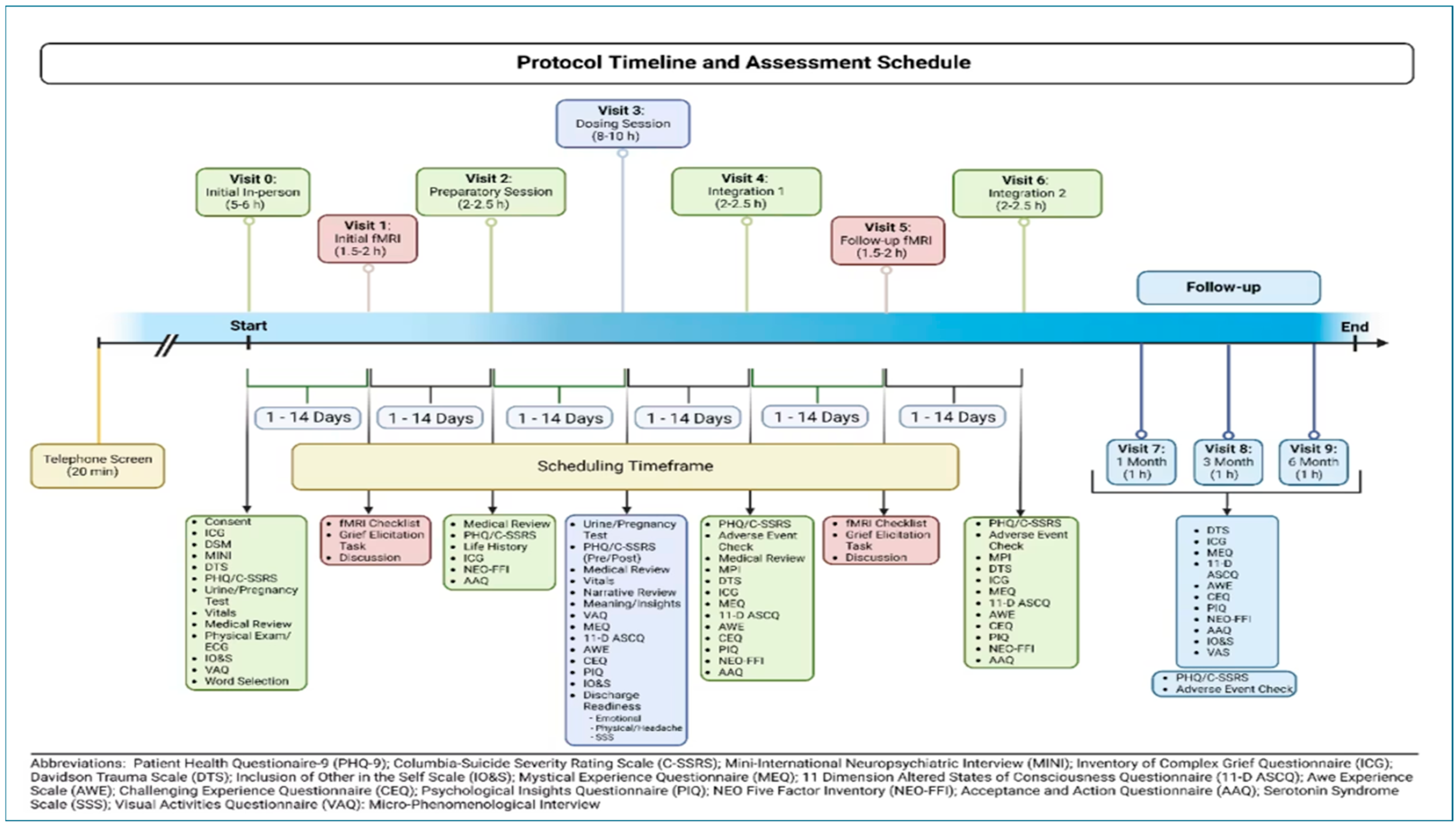 14]. These sessions will involve semi-structured interviews regarding the subjective experiences and their impact on the participant and their grief, with the first interview focused on phenomenological experiences and the second on the microphenomenology of a specific salient experience. Functional MRIs will be conducted prior to and following psilocybin dosing, per the schedule in