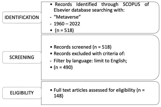 Quality journals are the basis for selecting quality publications for a literature review. Therefore, the database Scopus, run by Elsevier Publishing, was considered for the search for relevant literature, being the most significant abstract and citation source database used in recent reviews. The following research chain: “Metaverse”, searching under title, abstract, and keywords, was used.