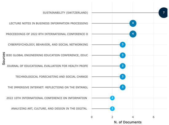 Figure 3 shows the sources that have published most documents on the topic. With seven documents published, the journal Sustainabilty published more research than any other journal. The series of conference proceedings Lecture notes in business information processing ranks second with four publications, followed by the proceedings of 2022 8th International Conference of the immersive learning research network, with four publications.