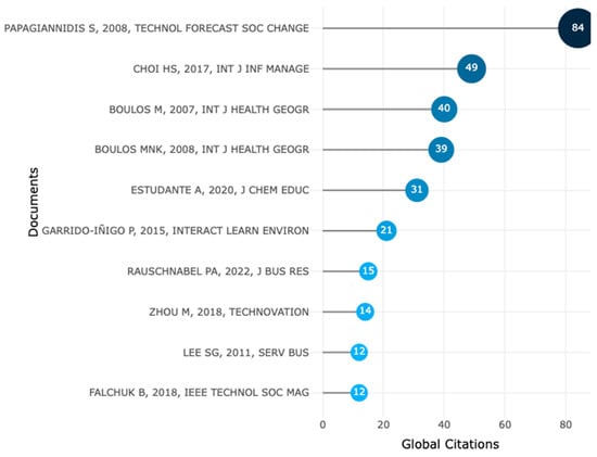 Interesting findings emerged considering the most globally cited documents that allow us to identify the seminal articles according to the timeliness, utility, and quality expressed by the scientific community’. Figure 4 shows the number of author citations for each article, identifying seminal works. Two of the most popular bibliometric indicators used to determine an article’s quality are the number of citations and the studies cited in an article. With 84 global citations, the article ‘Making real money in virtual worlds: MMORPGs and emerging business opportunities, challenges and ethical implications in metaverses’ [124] is the most cited, followed by ‘A content service deployment plan for metaverse museum exhibitions—Centering on the combination of beacons and HMDs’ [7] with 49 citations and ‘Web GIS in practice V: 3-D interactive and real-time mapping in Second Life’ [44], with 40 citations.