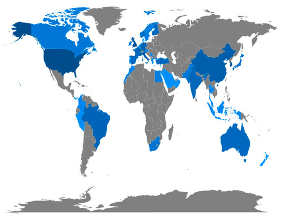 Concerning the country’s scientific production, Figure 5 shows that publications on the topic in the USA amount to 44. The UK ranks second, with 36 publications, followed by South Korea with 29 documents and Italy with 19. The countries in blue on the map have published research on the topic. The more intense the colour, the greater the scientific production.