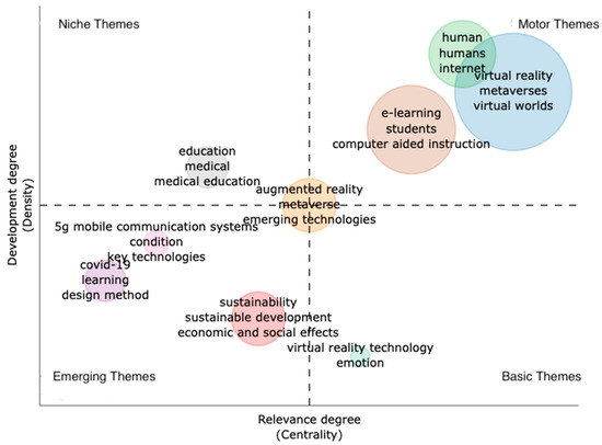 Motor themes (upper-right quadrant, strong centrality and high density) identify well-developed and relevant areas of academic investigation that can drive future research. As the study’s main result, metaverses have been investigated as “virtual reality” and “virtual worlds”. The importance of adopting the metaverse as a virtual world useful for “e-learning”, “computer-aided instruction” and “human” perspective, represents another relevant aspect of the academic analysis.