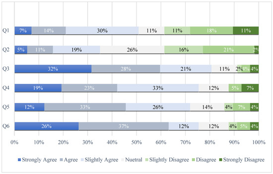 Table 3). However, it should be noted that there were a few students who were using the VR Oculus Quest headset for the first time, and it took longer for them to understand the subject matter (Q5: weighted average = 3.93). This suggests that there might be a learning curve associated with using virtual reality (VR) technology for educational purposes. Additionally, some students reported experiencing motion sickness during the VR experience (