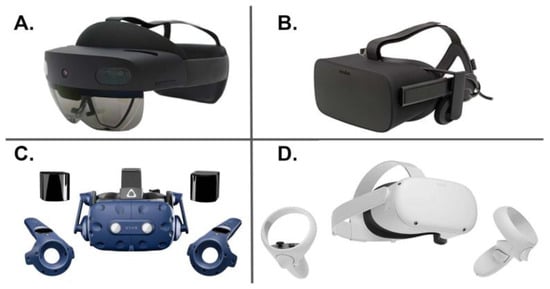 Extended reality (XR) is an umbrella term used to describe a spectrum or continuum of “virtuality” technology mediums that are designed to alter our real-world view, including augmented reality (AR), virtual reality (VR), and mixed reality (MR) [3,6]. At one end of the spectrum is AR, referring to technology that augments the real-world view by overlaying or superimposing virtual objects onto it. This is typically achieved by using hardware such as smart glasses or smartphone/tablet devices, allowing users to see the digital elements while permitting full visibility of the user’s real-world surroundings [3,7]. At the other end of the spectrum is VR, which significantly differs from AR and involves the use of head-mounted displays (HMDs) or headsets to block out the real world entirely. This allows users to be fully immersed in a computer-simulated three-dimensional (3D) environment, creating the physical and mental sensation of being in a virtual world [3,7]. In VR, users can interact with the virtual environment via the use of handheld controllers and receive direct sensory (images and sounds) feedback [8]. One fundamental aspect of VR is the concept of immersion [9]. Immersion refers to the extent to which users feel fully engaged and absorbed in a virtual environment, perceiving it as a substitute for their real-world surroundings. Currently, to achieve immersion, several different technological HMDs can be applied, ranging from simple devices (utilising mobile smartphones with compatible headsets) to more advanced systems, such as the HTC Vive and Oculus Rift (as displayed in Figure 1). Head-mounted displays are designed to substitute the user’s real visual senses, allowing them to perceive and interact with the virtual environment as if it were real. Mixed reality sits in the middle of the spectrum between AR and VR, further blending the real and virtual worlds within a single display [2,6]. In MR, the real and virtual worlds blend seamlessly, creating an environment where physical objects behave as if they were part of the virtual world [6]. This integration is generally achieved through the use of HMDs to create experiences for purposeful interactions [4].