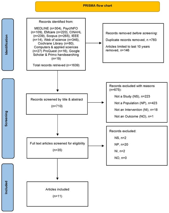 As per the flowchart illustrated in Figure 2, the comprehensive search strategy identified 1639 records. After duplicates were removed and date limitations were applied, 710 records were subject to the first round of screening (by title and abstract). Following the second round of screening, 11 articles (7 study papers and 4 study protocols) met the review criteria and were subject to quality appraisal. As anticipated in the review protocol, the heterogeneity of included articles, intervention types, and outcome measures precluded any pooling of results for meta-analysis, with the results presented as a narrative synthesis instead.