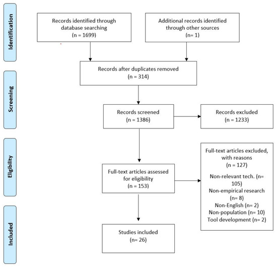 The search process resulted in 1700 articles. After 314 duplicate articles were removed, 1386 articles remained. Titles and abstracts were screened for relevancy, yielding 153 full-text articles for eligibility assessment. Following the application of exclusion criteria, 127 articles were excluded with reasons, and 26 eligible articles were considered directly related to the research question. The full texts of these articles were then reviewed as outlined in the Preferred Reporting Items for Systematic reviews and Meta-Analyses extension for Scoping Reviews (PRISMA-ScR) flow diagram [23] (Figure 1).