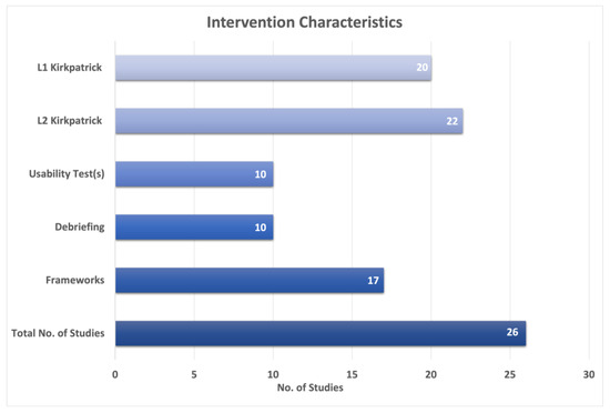 As outcome measures, the pedagogical benefits of fully IVR include experience and perception, student satisfaction, clinical knowledge, skill performance, confidence, attitudes and motivation, critical thinking, and clinical reasoning. This review’s outcomes were categorised and assessed using Kirkpatrick’s four-level evaluation framework [55]. The framework comprises four levels: reaction, learning, behaviour, and results. Most of the included studies assessed more than one outcome that could be categorised within level one and/or level two of the Kirkpatrick evaluation framework. However, none of the studies gathered data on behaviour or results. More details on the category of outcomes are given in Table S2 (Supplement File S2). Figure 2 shows the characteristics of interventions and outcomes used in included studies.