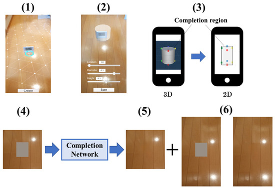 In the field of mixed reality (MR), which merges the virtual world with the real world, a study using DR based on machine learning has also been reported [20]. In this study, cars and people were removed in real space, and virtual objects were displayed in their place. However, the types of objects to be removed were limited. In addition, since client servers are used for DR and AR processing, an Internet environment is essential.