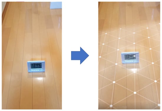 ARCore can detect planes, such as floors and walls, from characteristic points detected by COM. The constructed virtual planes are displayed as triangular meshes, as shown in Figure 2.
