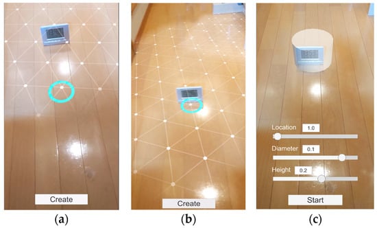 As shown in Figure 3a, the intersection between the virtual plane and the optical axis of the camera is calculated and visualized using a pointer. The pointer is displayed as a blue circle as shown in Figure 3a,b. Then, as shown in Figure 3b, a user moves the pointer to the position right under the object to be removed, and the create button is pressed to place a virtual cylinder with the 3D coordinates of the pointer as the center of the bottom surface, as shown in Figure 3c.