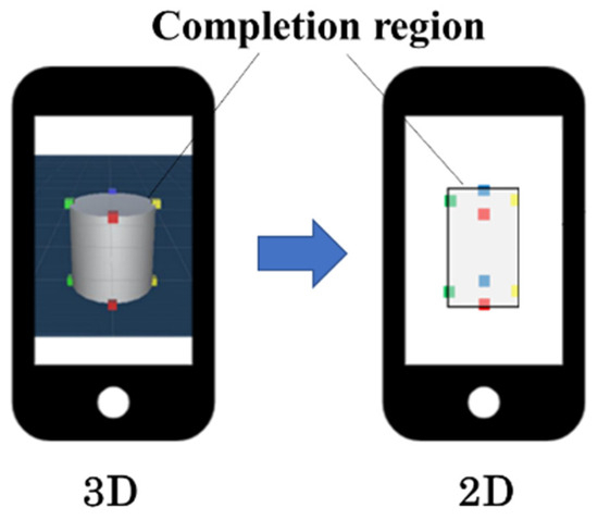 - The 3D coordinates of eight points that could be the top, bottom, left, or right edge on the contour of the virtual cylinder are calculated. The coordinates of each point in the camera image are calculated from the camera parameters and the 3D coordinates, and their bounding rectangles are used as the 2D completion region.
