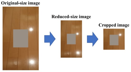 In step (4), the 2D completion region in the camera image is filled with the mean pixel values of the dataset for training to create the input image for the completion network. Inputting the camera image directly into the completion network would require a significant processing time. Therefore, to reduce the processing time, the camera image is first scaled down and then cropped to create a square image containing the completion region, as shown in Figure 5. This cropped image is used as the input image for the completion network.