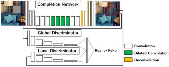 GLCIC is a GAN-based method that is used to train image completion. As shown in Figure 6, GLCIC differs from a typical GAN because it consists of three networks. These networks are called the completion network, global discriminator, and local discriminator.