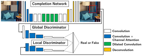 Channel attention has been newly incorporated into GLCIC to improve the completion accuracy of the generated completion image. Channel attention is a technique that weighs the channels of a convolutional neural network (CNN) feature map, highlighting important features and improving the quality of the network representation [24]. The layers incorporating channel attention were determined experimentally. In our implementation, the channel attention was added to the completion network at layers 2, 3, and 4; to the global discriminator at layers 2, 3, and 4; and to the local discriminator at layers 1, 2, and 3, as shown in Figure 7.