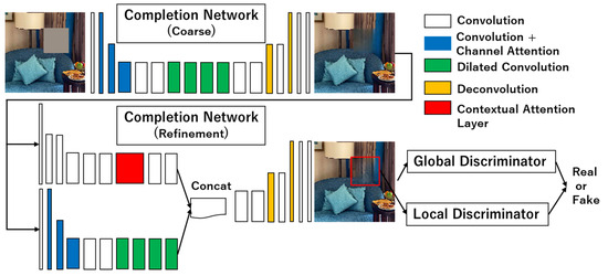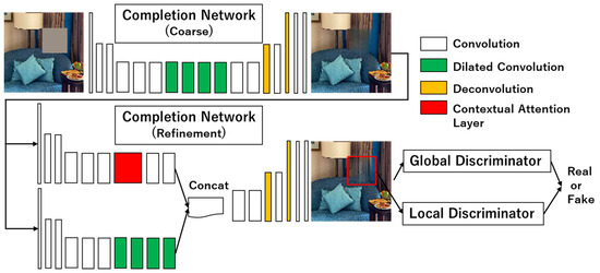 To improve the quality of the generated completion images, we incorporated contextual attention into the network. Contextual attention is a technique that uses the surrounding texture and structure correlated with the target region for image reconstruction [25]. However, since contextual attention cannot be used for completely uncorrelated objects, the coarse completion network roughly completes the region once, as illustrated in Figure 8. Subsequently, the refinement completion network, which includes the contextual attention layer, is used for more precise completion.