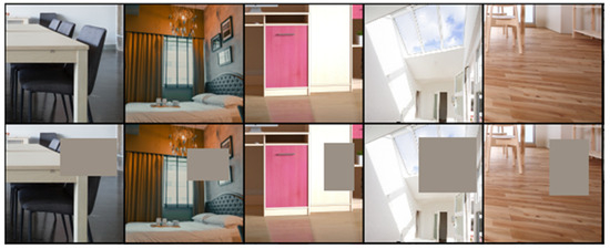 The network is trained to recover the original background from the completion region image. The size of the completion region was determined as w × h (pixels), where w and h were randomly determined to be in the range of 16 to 64. Figure 10 shows examples of the original images (correct answers) and the images with completion regions (input images).