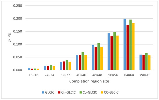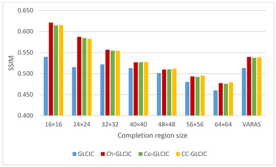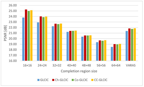 Figure 11, Figure 12 and Figure 13 show the completion accuracies of each network for each size of completion region and the completion regions of VARAS. Larger values for PSNR and SSIM represent better evaluations, while smaller values for LPIPS represent better evaluations. Ch-GLCIC, Co-GLCIC, and CC-GLCIC were more accurate than GLCIC in all completion region sizes for all measures. A comparison of Ch-GLCIC, Co-GLCIC, and CC-GLCIC shows that Ch-GLCIC and CC-GLCIC have higher completion accuracies than Co-GLCIC in all measures. In PSNR and SSIM, Ch-GLCIC showed the most improved completion accuracy compared to GLCIC at a 16 × 16-pixel completion region, with PSNR and SSIM being improved by more than 1 dB and 0.08. In LPIPS, Ch-GLCIC showed the most improved completion accuracy compared to GLCIC at a 64 × 64-pixel completion region, with LPIPS improving by approximately 0.024.