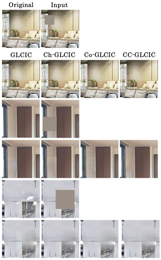 Table 1 shows the results. Among the four networks, Ch-GLCIC and GLCIC exhibited the fastest generation speeds, which can be attributed to their smaller network sizes compared to Co-GLCIC and CC-GLCIC. The generation speeds of GLCIC and Ch-GLCIC were almost the same, which shows that channel attention does not have a great effect on the generation speed.
