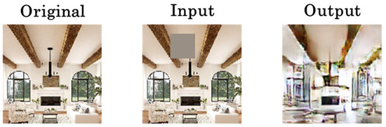 The completion images generated using the completion network are combined with the original image only in the completion region, and the other regions are not used. However, completion regions are completed by the surrounding information. Therefore, if the accuracies of the non-completion regions are low, the accuracies of the completion regions are also expected to be low. On the other hand, the completion network of GLCIC focuses only on the completion region and trains using only the MSE loss in the completion region [23]. Figure 15 shows an example of the completion network’s output image. Since the MSE loss out of the completion region is not taken into account, the generated image out of the completion region is degraded compared to the original image.