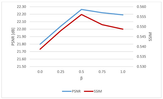 The completion accuracies were evaluated by varying the value of β to determine its optimal value. The values of PSNR and SSIM for different values of β are presented in Figure 16, where they represent the average values obtained for seven different completion region sizes. As can be observed from Figure 17, the network trained with the new loss function (β > 0) performs better than the network trained with the conventional loss function (β = 0). The highest completion accuracy was achieved when β was set to 0.5.