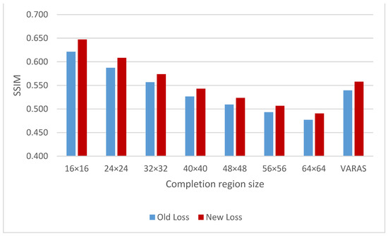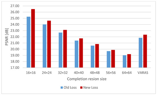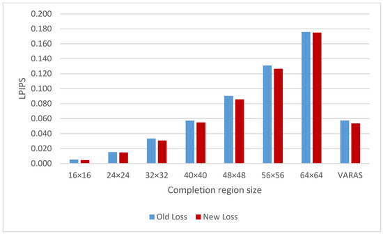 Figure 17, Figure 18 and Figure 19 show the completion accuracies of the conventional loss function and the new loss function (β = 0.5) for seven different completion region sizes and completion regions of VARAS. For all three measures, the completion accuracy was improved by the new loss function. In PSNR and SSIM, the improvement in completion accuracy was most significant at the 16 × 16-pixel completion region, where PSNR and SSIM increased by approximately 1.2 dB and 0.03, respectively. In LPIPS, the largest improvement was seen at the 56 × 56-pixel completion region, with an improvement of approximately 0.004.