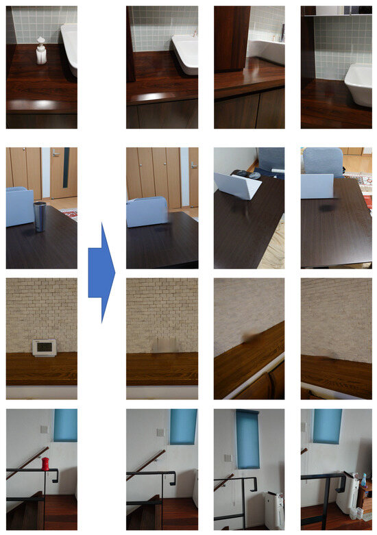 Examples of DR using the completion-type method include object removal in panoramic images [12], the removal of unwanted people and objects in photographs [13,14], and the removal of AR markers [15,16,17]. A study of object removal from panoramic images [12] aimed to remove furniture from a spherical panorama of an indoor scene. The method used in this study fills in the objects in the image once with white. Then, it uses a deep learning network to restore the filled-in area to a scene without objects in it, matching it to the surrounding background. The function of removing unwanted people and objects in a photo [13,14] is actually implemented in image editing applications as removing tools. They can remove objects from an image by specifying the objects to be removed. In the examples [15,16,17], AR markers are removed by applying traditional completion-type methods, such as generating backgrounds by calculating information from the surrounding background, and using backgrounds with similar patterns clipped from previous frames.