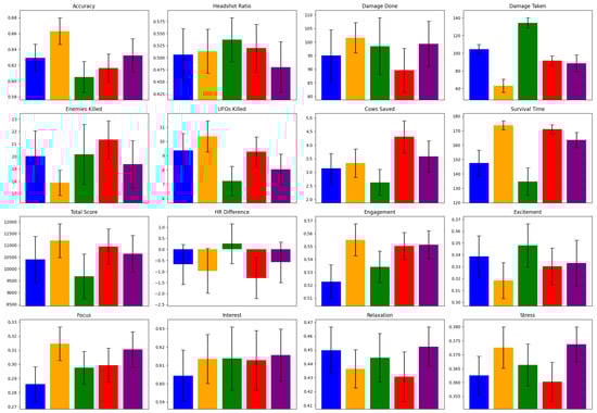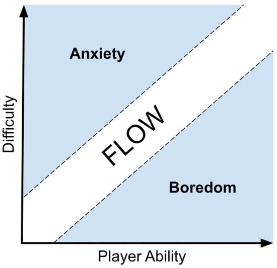 Many studies have explored DDA and its benefits [2]. Specifically, performance-based DDA emerges as a prevalent alternative to conventional static game difficulties. This approach employs in-game performance metrics, such as accuracy, damage dealt, and total score, to adjust difficulty dynamically. Research on performance-based DDA spans genres, from first-person shooters [10,11,12] to Massively-Multiplayer Online (MMO) games [13] and Multiplayer Online Battle Arena (MOBA) titles [14]. Romero-Mendez et al. [15] utilized deep learning to classify players’ skill levels and applied performance-based DDA, significantly enhancing gameplay engagement and immersion in an arcade shooter. In the context of enhancing player engagement in VR exercise games, Huber et al. [16] proposed using procedurally generated environments alongside DDA to dynamically tailor game levels to players’ physical capabilities. Francillette et al. [17] developed and tested a model for performance-based DDA within a platformer environment, assessing difficulty through static danger zones and enemy movement patterns.