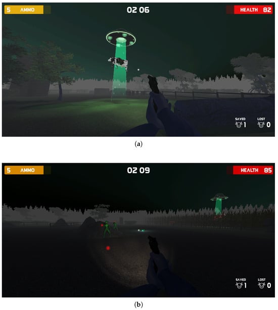 To test our Dynamic Difficulty Adjustment methods, we developed a custom game with several difficulty levels. The game, a first-person shooter titled “Cattle Catchers from Outer Space” (see Figure 2 for screenshots of the game), belongs to the endless survival genre. In this game, players aim to survive for as long as possible while defending against alien invaders. Apart from survival, players can also strive for high scores by accomplishing secondary objectives, which include escorting cows to safety, collecting crystals from defeated enemies, and protecting cows from unidentified flying objects (UFOs) aiming to abduct them. We have incorporated seven difficulty levels, ranging from extremely easy (1) to extremely hard (7), altering in-game variables associated with the enemies and the player character.