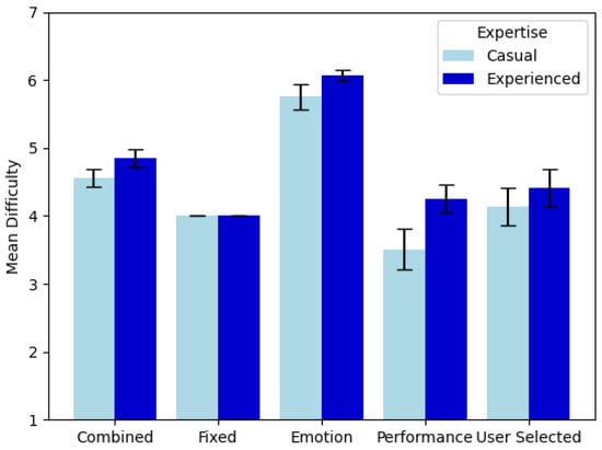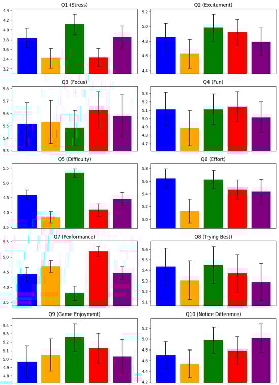 The Mann–Whitney U Test was employed to discern differences between in ordinal responses between the two gaming experience groups (casual vs. experienced) for each questionnaire item, detailed in Table 12. The analysis found no significant differences between the two groups across a range of questions, including Stress (Q1), Excitement (Q2), Focus (Q3), Fun (Q4), Trying Best (Q8), Game Enjoyment (Q9), and Noticeable Difference between techniques (Q10), indicating the uniformity in participants’ perceptions across these aspects regardless of the DDA technique used. However, significant distinctions emerged between casual and experienced players in specific areas: