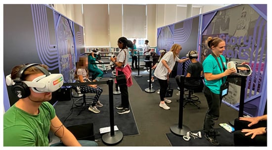 During the summer of 2022, StoryTrails embarked on a tour of 15 libraries across Great Britain and Northern Ireland, giving thousands of people the opportunity to try a variety of story-led immersive experiences that drew heavily on local stories and National Archive footage. The VR component of the tour comprised six ten-minute experiences, covering topics ranging from punk rock (“Get Punked!” by Visualise) to retro footage of the future (“The Museum of Imaged Futures” by Indigo Storm) to the first transgender adoption in the UK (“Kindred” by Electric Skies). A dedicated VR area was set up at each location where up to eight people could try the experiences simultaneously (see Figure 1) throughout the day (which lasted between 7–10 h). All experiences were run on a fleet of Meta Quest 2 headsets equipped with an Elite Strap + battery, with each headset’s battery life lasting approximately 3–4 h. To ensure uninterrupted usage, headsets were swapped out midway through the day after about three hours of use.