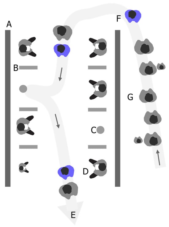 Schematic showing (A) partitions, (B) low dividers, (C) swivel stools, (D) people viewing VR experiences, (E) exit from the area, (F) onboarders (in blue), (G) the queue. A wide light-grey arrowed line has been added to the figure, indicating a typical path a person would undertake (from queue to doing VR experience to exit).