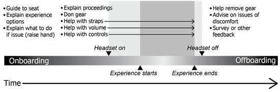 Onboarding has been defined as “the process followed to guide users to understand technically and conceptually how to participate in a VR experience, facilitating their ability to successfully attend to and participate in the experience” [4]. Once the user has taken part in an experience, the reciprocal process of offboarding should then be conducted to help the user remove equipment and ensure the user receives assistance with any arising issues of discomfort (this latter point is often forgotten about but is perhaps even more important than onboarding—a wide range of discomforts may be experienced by the user, ranging from nausea, sensory overload, to violations of personal space; [5,6]; for an in-depth discussion, see [4]). Figure 3 illustrates the various steps that can be involved during onboarding and offboarding for an event such as that detailed here (for the curious, there are various steps in addition to those laid out, ranging from handing out content aimed to make people aware of what happens during a VR experience or to highlight any sensitive themes of the available experiences, to marketing and advertising; [7,8]).