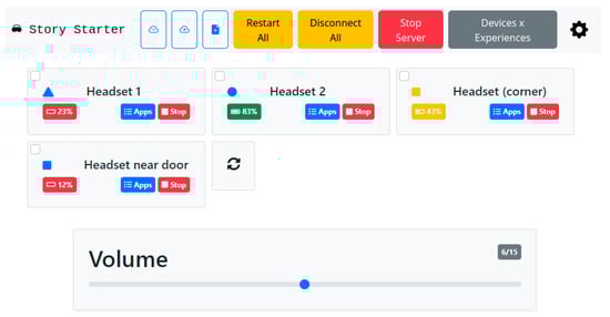 Illustration of the front end of Story Starter (using the Bootstrap 5.3 CSS framework, https://getbootstrap.com/, accessed on 14 June 2023). This includes features such as a universal volume control for all headsets and the ability to start experiences on several headsets simultaneously or per headset.