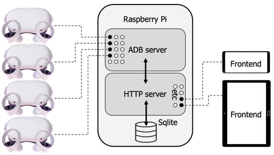 Illustrating the communication between the different pieces of hardware encompassing Story Starter. Dashed lines represent bidirectional wireless communication via a Wi-Fi router. ‘Etc’ has been added to the figure to illustrate that many other devices could connect to the HTTP server—this is in contrast to only up to 15 headsets being able to be connected to the ADB server at any one time (discussed in the Challenges section later).