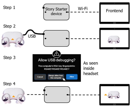 Figure 6 displays the linking process required to connect each headset to Story Starter. To begin the linking process, the headset must be switched on and put into ‘developer mode’ [12]. Each time the headset is switched on, the following steps must be followed. The headset must be physically connected to the Story Starter device using a USB cable. Once connected, a request will appear on the headset asking permission to ‘allow USB debugging.’ This request must be accepted (Step 2; selecting ‘Always allow from this computer’)—henceforth, this step is not required in future linkups for this headset. The device will then appear within the Story Starter interface, which can be wirelessly connected to Story Starter with a button click (Step 3). Once connected, the USB cable can be detached (Step 4). After completing these steps, the (now wire-free) headsets are ready to use until they run out of power.