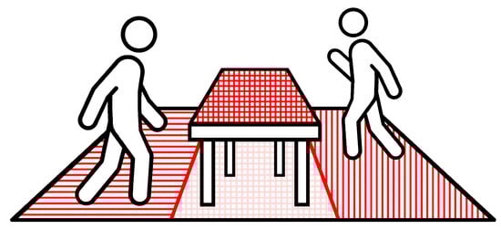 Conceptual division of the example environment. The table surface (checkered) is shared, whereas the left (horizontally ruled) and right (vertically ruled) areas belong to individual users.