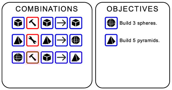 Apart from the interactive elements discussed above, there are also static information panels (cf. Figure 6) in the environment showing users the overall objective (i.e., which and how many products to produce), possible combinations, and the current status (i.e., how many products have been produced). As discussed in Section 3.1, these panels can be shared or only visible to an individual user. Informational asymmetry, as in the latter case, can be crucial to specific task types. For example, one user may see “two cubes with a hammer produce a sphere”, while the other sees “a cube and a sphere with a wrench produce a cylinder”. The objective in this case can be set to produce five cylinders, such that the two users must communicate and work collaboratively to reach the goal.