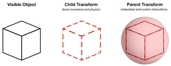 In XR MUSE’s dual-transform design (cf. Figure 7), two objects with a parent–child relationship in the same hierarchy are considered to be on the same level, with the authoring determined by one of the two transformations. The parent transform typically is the networked GameObject; its transform is synced, and when the user does not own the object, that parent transform is in charge of the dual-transform’s authoring. The child transform is not synced but takes the dual-transform’s authoring when the user owns the synced GameObject, typically having the physics, local controls, and gestures over the object (cf. Figure 7).