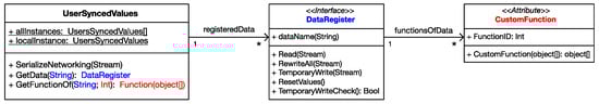 More concretely, these user-specific data are created through a dedicated GameObject, to which we provide interfaces to append any custom type of data, which may also define accessible custom functions. That dedicated GameObject has a main component, UserSyncedValues, which handles the order of registered data, triggering serialization, and providing access to the various data and associated functions. This is realized using the C# programming language’s reflection feature, which means that when loading, the object builds internal dictionaries of references to the corresponding exposed resources. Then, any number of user-defined DataRegister components that add data and functions for synchronization with the UserSyncedValues component can be added to it. The DataRegister components can mark each function as accessible via UserSyncedValues with a specific identifier (cf. diagram in Figure 11).