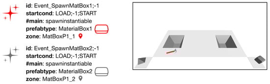 Text files that are loaded at run-time also allow a form of scripting through a so-called events sequence. To handle the events sequence, XR MUSE uses a custom timeline, which also includes the production of log data. Event-specific logs may be produced during a trial except for the TIMELINE_LOAD and TIMELINE_START events. Events are either loaded from files or produced by other events They have an ID, a behavioral type (possibly custom), and a set of start conditions. The start conditions set is a collection of event-produced logs that all must be recognized. A log is a combination of an event’s ID (or the default IDs for timeline load and start) and log type. The currently available log types are START, END, SUCCESS (which also produces END), and FAIL (which also produces END). Several generic events are available as examples and are sufficient for basic experiments, such as timers, instantiable spawning, or stimuli activation. Events can be declared as text files, just like instantiables and stimuli, with behavior-specific parameters that may refer to IDs of other declared files (such as an instantiable ID in the case of spawning instantiables) and the start condition logs. The example material boxes depicted in Figure 12 can be loaded by spawner events at loading, as shown in Figure 13.
