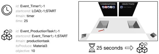 As an example of more advanced scripting, a timer event may start with the automatic event TIMELINE_LOAD while another production task event has the success of the timer event as a starting condition (cf. Figure 14). When the timer generates its end log, the material production task can be started.